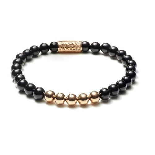 Rebel & Rose Black Panther RR-60001-R-19 Armband Trendy en stoere Rebel & Rose armband voor dames en heren in het zwart uit de serie More Balls Than Most. De RR-60001-R-19 Rebel en Rose armband is gemaakt zwart natuursteen. De armband is voorzien van vijf rosékleurige kralen en als eyecatcher het PVD rosékleurig vergulde Rebel & Rose logo. De lengte van de arrmband is 19 cm. Alle Rebel and Rose bracelets worden gemaakt van de beste materialen. Een Rebel & Rose armband is een stoere armband voor dames en heren en perfect te combineren met andere juwelen en diverse outfits.- Serie: More Balls Than Most- Natuursteen, Zwart- Vijf kralen, PVD rosékleurig verguld- Breedte: 6mm- Maat: L - Lengte: 19 cmValentine is officieel dealer van Rebel&Rose