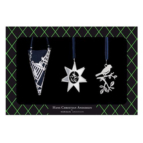 Deze set van Hans Christian Andersen Home is gebaseerd op knipsels die Andersen tijdens zijn reizen maakte. Deze knipsels waren vaak geïnspireerd door de sprookjes die hij schreef, of door mensen die hij ontmoette.Deze set is zilverkleurig, en bevat 3 ornamenten: een geschenkshoorn waar je kleine cadeau's of snoep in kunt doen, en twee hangers. De hangers zijn gebaseerd op het sprookje De Chinese Nachtegaal.Hans Christian Andersen was een sprookjesverteller uit Denemarken. Hij schreef bekende verhalen zoals Het Lelijke Eendje en De Kleine Zeemeermin. Naast dat hij op papier schreef maakte hij er ook graag ware kunstwerkjes van. Deze knipsels zijn nu te vinden in privécollecties of het Hans Christian Andersen museum in Odense, Denemarken. Nordahl Andersen (overigens geen famillie) wilde meer doen met deze knipsels, en heeft deze in vergulde vorm opgenomen in de collectie, zodat je thuis ook kunt genieten van deze prachtige knipsels. Je kunt ze gebruiken als decoratie in je huis (wat dacht je van een mooie krans aan de deur, om een kaarsje heen, of mooi in het raam?) of tijdens de feestdagen ophangen aan een Paastak of in de Kerstboom. Op deze manier maak je er sprookjesachtige feestdagen van!