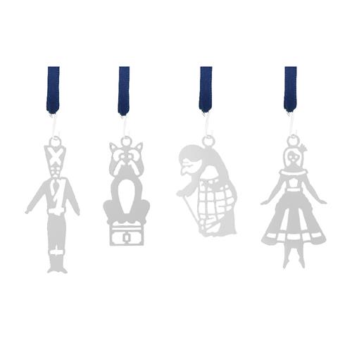 Deze hangers van Hans Christian Andersen Home is gebaseerd op knipsels die Andersen tijdens zijn reizen maakte. Deze knipsels waren vaak geïnspireerd door de sprookjes die hij schreef, of door mensen die hij ontmoette.Deze set bestaat uit 4 verzilverde hangers, met bijpassende groene en blauwe linten. De figuren zijn gebaseerd op het sprookje De Tondeldoos. Ze zijn ongeveer 3.5 tot 5 cm groot.Hans Christian Andersen was een sprookjesverteller uit Denemarken. Hij schreef bekende verhalen zoals Het Lelijke Eendje en De Kleine Zeemeermin. Naast dat hij op papier schreef maakte hij er ook graag ware kunstwerkjes van. Deze knipsels zijn nu te vinden in privécollecties of het Hans Christian Andersen museum in Odense, Denemarken. Nordahl Andersen (overigens geen famillie) wilde meer doen met deze knipsels, en heeft deze in vergulde vorm opgenomen in de collectie, zodat je thuis ook kunt genieten van deze prachtige knipsels. Je kunt ze gebruiken als decoratie in je huis (wat dacht je van een mooie krans aan de deur, om een kaarsje heen, of mooi in het raam?) of tijdens de feestdagen ophangen aan een Paastak of in de Kerstboom. Op deze manier maak je er sprookjesachtige feestdagen van!4 stuks hanger miniatuur. De Tondeldoos - verzilverd.Deze hangers zijn gebaseerd op de knipsels van Hans Christian Andersen´s verhaal De Tondeldoos. Een soldaat krijgt van een heks een tondeldoos, en moet vervolgens van alles doen om zijn schat te verkrijgen...Deze miniaturen zijn motieven van de aansteker - de soldaat, de prinses, de hond op de schatkist en de heks.De hoogte is 3,5 - 5 cm. Blauwe en groene banden zijn inbegrepen, zodat de hangers voor zowel Kerstmis als Pasen kunnen worden gebruikt. De levering is een mooie, lichte doos met het bekende Harlequin-patroon.Valentine is officiele dealer van HC Andersen Home.