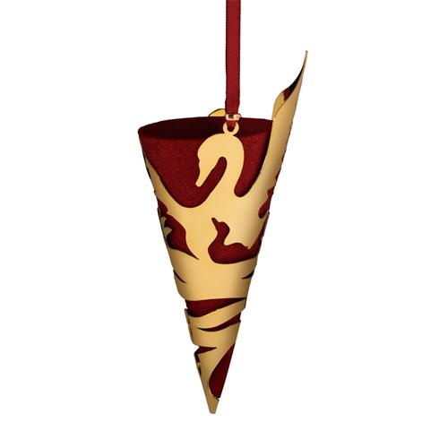 Geschenkshoorn Het Lelijke Eendje met rood vilten binnenkant en goudkleurig messing. Het messing verbeeldt het verhaal van Het Lelijke Eendje, een sprookje van Hans Christiaan Andersen. Nordahl Andersen (overigens geen familie) maakte van de knipsels kleine kunstwerkjes die in huis gebruikt kunnen worden om een sprookjesachtige sfeer in huis te halen. Je kunt de decoraties van HC Andersen Home ophangen in de kerstboom tijdens de feestdagen, in een Paastak, of juist het hele jaar door aan bijvoorbeeld een mooie krans of een mooie kaars.