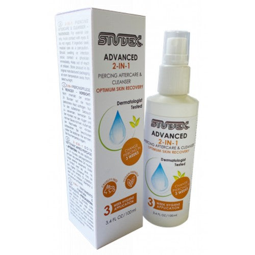 Studex Advanced Piercing aftercare&Cleanser. nr 9907 bottle with 100 mlNaverzorging reinigingsmiddel ,vervang je oorbellen sneller.Piercing:3 weken in plaats van 6 weken.Piercing in het kraakbeen:8 weken in plaats van 12 weken. Vermindert roodheid en irritatie tijdens het genezingsproces,vermindert kans op infectie. Verzorgt en kalmeert de huid bevat geenschadelijke stoffen, dermatologische getest en en heeft een natuurlijke PH waarde.Valentine is Officiele dealer van Studex.