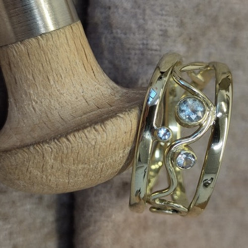 Valentine Jewellery goud heeft verschillende sieraden voor u.Waaronder deze handgemaakte ring. Thema; water. De golf in de ring geeft het water aan de steen accentueert de kleur aqua blauw.De hanger is gemaakt door Annemiek student van de vakschool schoonhoven. U heeft twee jaar garantie. En 30 dagen ( bedenk) tijd om het pakketje eventueel te retourneren.