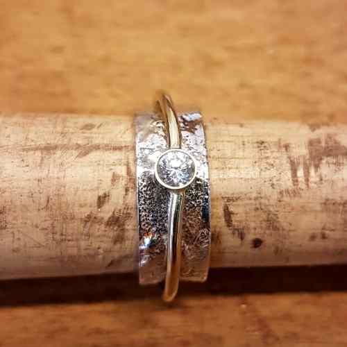 Handgemaakte sieraden uit het atelier van Valentine Juwelier. Deze damesring met zirkonia heeft een brede band van zilver met een smallere band van goud met daarop een zirkonia van 4mm. Een prachtige, handgemaakte ring met een ruw oppervlakte en verfijnde details.