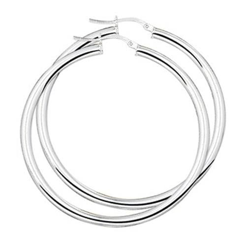 Valentine Jewellery ronde creolen met klik-systeem:Materiaal: Zilver gerhodineerd Doelgroep: DamesDiameter: 48 mm Dikte: 4.0 mm Soort: Ronde creolen Afwerking: GepolijstDe creolen hebben een klik-systeem als sluiting.